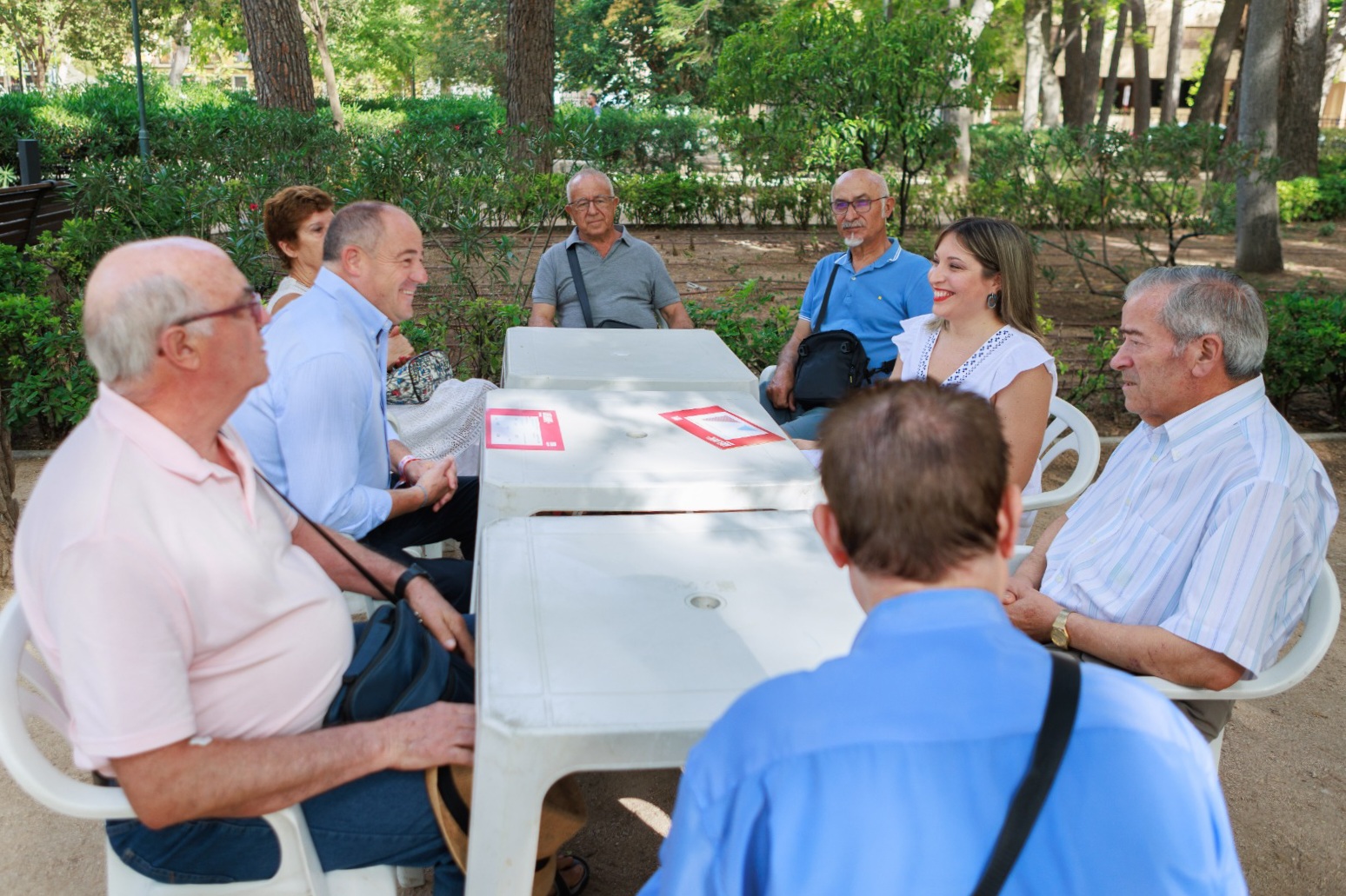 Albacete, 10 de julio de 2023.- Los candidatos socialistas al Congreso y al Senado por Albacete, Emilio Sáez y Amparo Torres, respectivamente, han mantenido este lunes, en el parque Abelardo Sánchez, un encuentro con integrantes de la Unión Democrática de Pensionistas de C-LM ‘Don Quijote’ (UDP), encabezada por Ramón Munera.