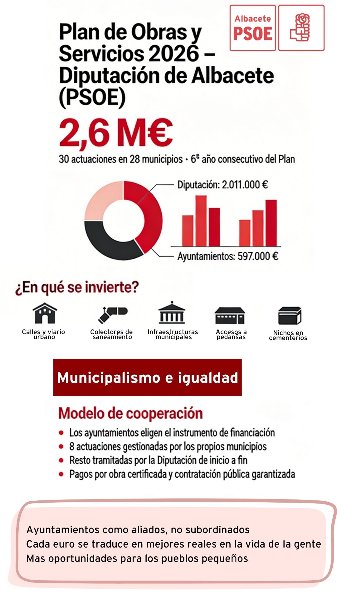 El Pleno de la Diputación de Albacete, liderada por el PSOE, ha aprobado el Plan Provincial de Cooperación a las Obras y Servicios de competencia municipal 2026, con una inversión global de 2.608.000 euros que impulsará 30 actuaciones en 28 localidades. Este plan, financiado con 2.011.000 euros de la Diputación y 597.000 euros de los ayuntamientos, representa la sexta anualidad consecutiva de compromiso socialista con el municipalismo real, fortaleciendo servicios públicos e infraestructuras en los municipios, especialmente aquellos de menos de 20.000 habitantes.