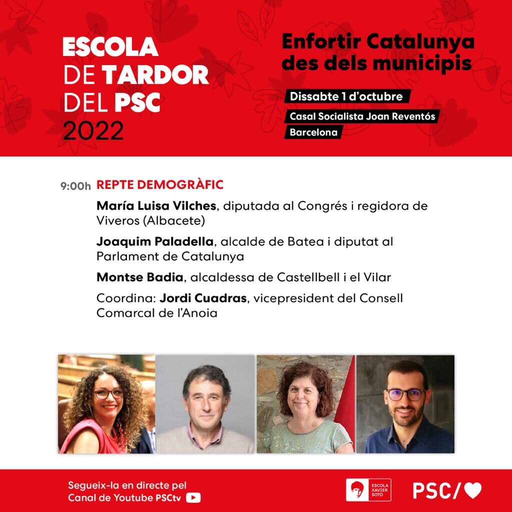 La diputada albaceteña, ha participado en esta jornada, que ha tenido lugar en la Casa Socialista Joan Reventós, y que tenía por tema “Fortalecer Cataluña desde los municipios”. Ha abordado distintos temas, como el futuro del municipalismo, la agenda urbana y la seguridad. Así la participación de Vilches ha sido en una mesa temática sobre el Reto Demográfico.